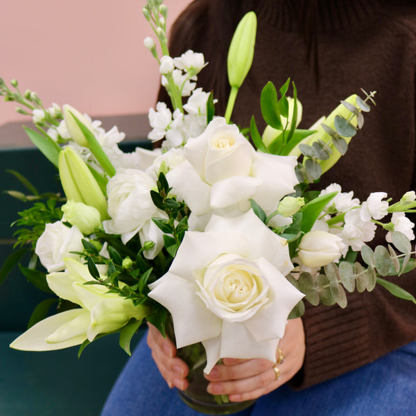 Featuring carefully reflexed playa blanca roses, white lilies, fragrant white stock, ranunculus, and lisianthus in a bed of seasonal greenery, this arrangement is a thoughtful choice. Seasonal spring accents include: Green Bee grown eucalyptus and tulips.
