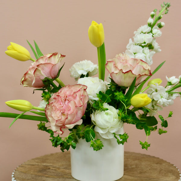 The Francesca features lovely spring colours and fragrant stock and roses: Country Candy roses, yellow tulips, white ranunculus, and white stock. It is a celebration of finding love again (or finally). Tulips continue growing toward the light, symbolizing continued growth.